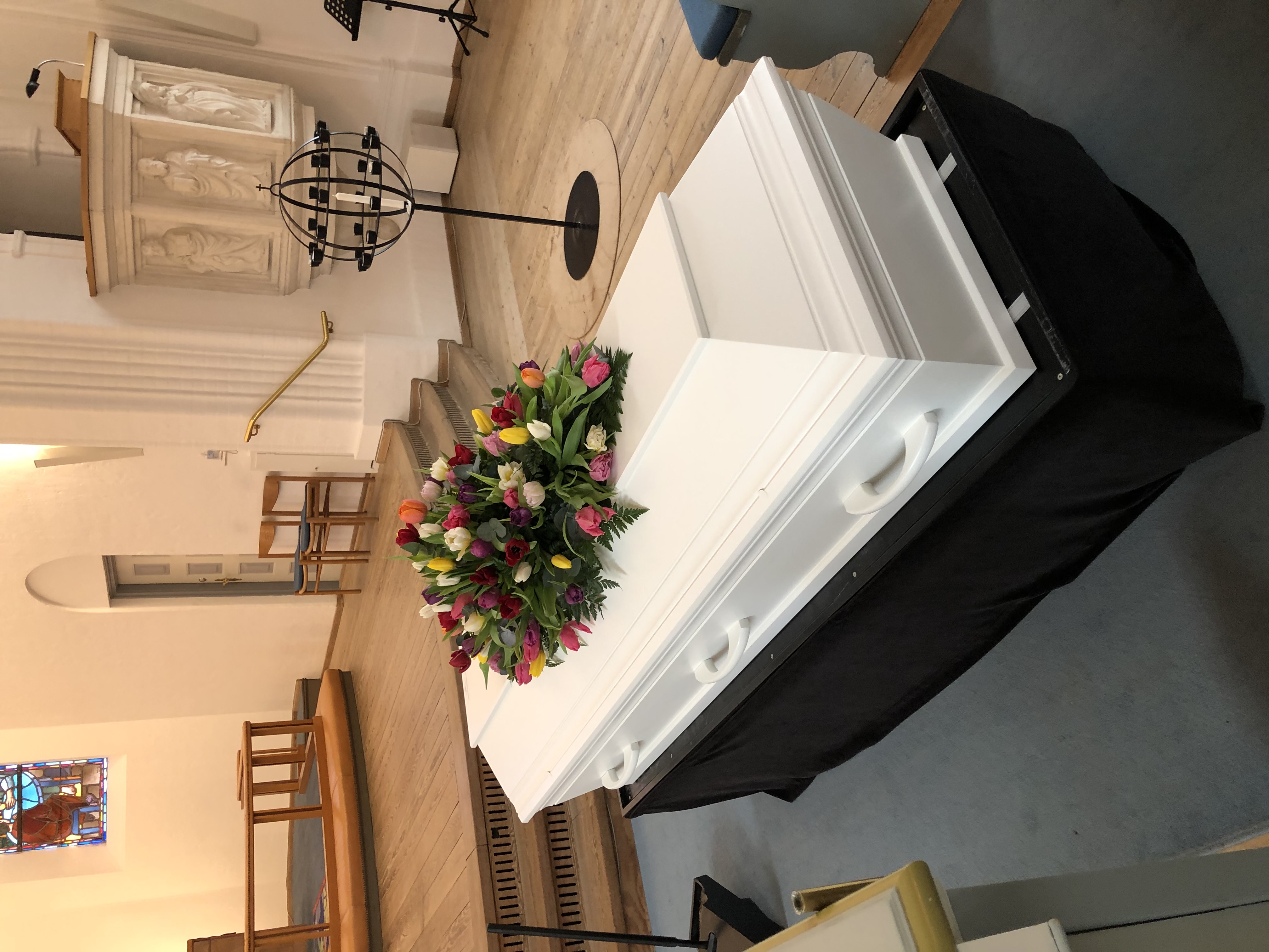 Inkluderer Hvid kiste "Svaneke" uden kistedekoration, ilægning i kiste, al nødvendig rustvognskørsel og honorar
